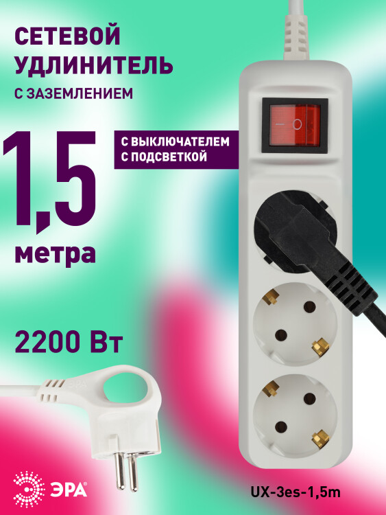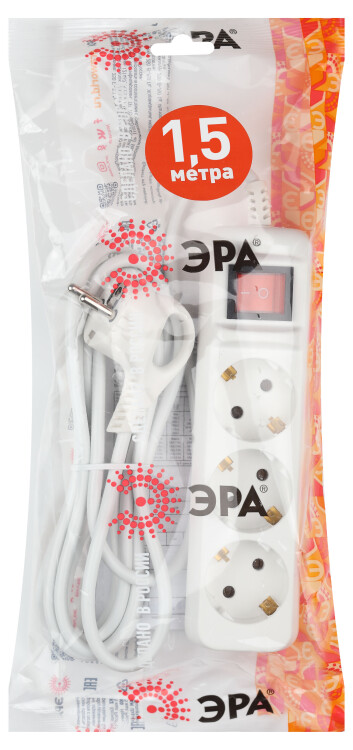 Удлинитель электрический Эра UX-3es-1,5m с заземлением, с выключателем, белый, 3 розетки. Провод ПВС, 3x0,75мм2, 1,5 м. Рассчитан на максимальную мощность 10А/2200 Вт. Удлинитель Эра станет Вашим надежным помощником, если Ваши любимые электроприборы находятся далеко от розеток. Провод в удлинителях Эра сделан из 100% меди, что делает его абсолютно пожаробезопасным. Корпус выполнен из ударопрочного и негорючего пластика (полипропилен). Вилка обеспечена кольцом для удобного извлечения ее из розетки. Модель удлинителя на 10А позволяет подключить бытовые приборы общей нагрузкой до 2200Вт. Дизайн удлинителя разработан в России командой Эра Style.