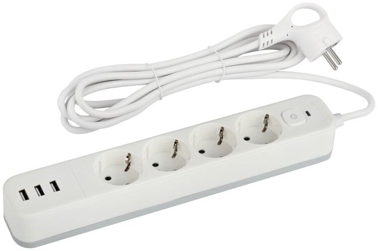 Сетевой фильтр Intro SFE430-3xUSBA-W с заземлением, с выключателем, 4 розетки, 3USB, провод 3 м, ПВС 3x0,75мм2. Базовый уровень защиты техники: от импульсных помех, от перегрузки, от короткого замыкания. Максимальная мощность 10А/2200 Вт. Корпус из негорючего пластика (полипропилен). Вилка обеспечена кольцом для удобного извлечения ее из розетки. Выключатель со световой индикацией позволяет выключить все приборы, подключенные к сетевому фильтру, не вынимая вилки из розетки. Отлично подойдет для защиты бытовой и компьютерной техники. Сетевой фильтр оснащен 3USB для зарядки мобильных устройств.