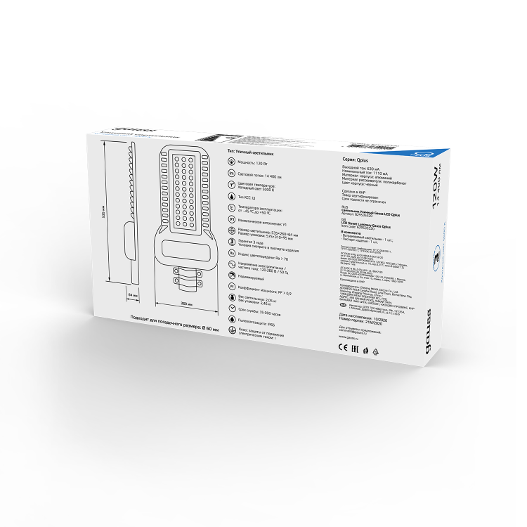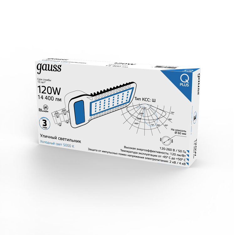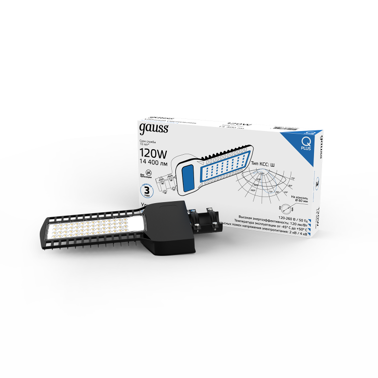 Светильник уличный консольный Gauss LED Qplus КСС "Ш" 120W мощный и экономичный. Он полностью заменяет ртутные и натриевые уличные светильники. Позволяет осветить большие территории: парковки, стоянки, склады и использоваться для удобства и безопасности передвижения в темное время суток на дорогах и придомовых участках. Литой корпус, высокая IP65 влагостойкость и простой надежный монтаж, а так же защита от импульсных помех позволяют эксплуатировать Gauss LED Qplus 120W максимально долго в условиях окружающей среды.