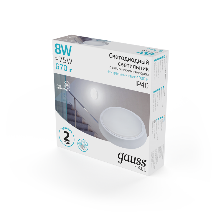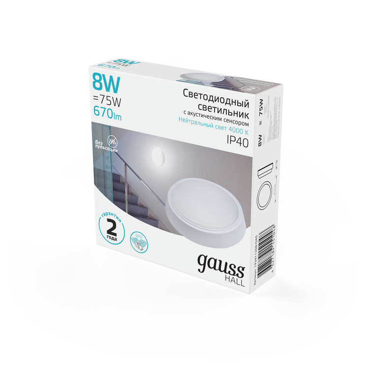 Св-к светодиодный Gauss IP40 D135*33 8W 670lm 4000K HALL круглый с оптико-акустическим сенсором 1/40