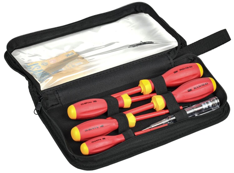 Набор диэлектрических отверток серии К3 рассчитан на использование под напряжением до 1000В. Набор включает в себя: крестообразную отвертку PH2х100; шлицевые - SL2,5х75, SL4,0х100, SL5,5х125; пассатижи К3 160мм и отвертку-пробник ОП-1.