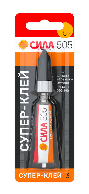 Тюбик располагается на компактной подложке из плотного картона и подвешивается вертикально. Дизайн супер-клея выполнен в узнаваемых цветах серии СИЛА 505 – чёрный, белый, красный, оранжевый.