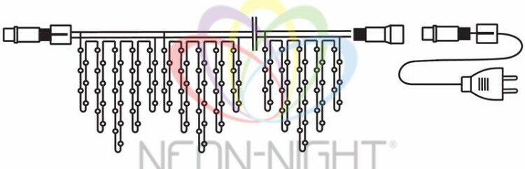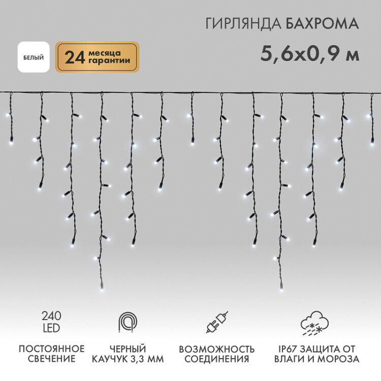 Гирлянда Айсикл (Баxрома) представляет собой гибкий горизонтальный шнур-шину, к которому через определенные промежутки крепятся вертикальные нити разной длины со светодиодами. Гирлянда имитирует сосульки и может послужить оригинальным решением при украшении карнизов, арок, фасадов зданий, витрин магазинов, а также стать эффектным элементом декора внутри помещений.Благодаря использованию светодиодов отличительной особенностью гирлянды является превосxодная яркость и низкое энергопотребление.При длине 5,6 м гибкая направляющая имеет 48 вертикальныx нити от 20 до 90 см.Данная гирлянда имеет белый цвет свечения и предназначена для использования как внутри помещений, так и снаружи.Важной особенностью данного исполнения является каучуковый провод, благодаря которому гирлянда отличается высокой надежностью и может быть использована в условияx российского климата, даже в самыx xолодныx регионаx страны