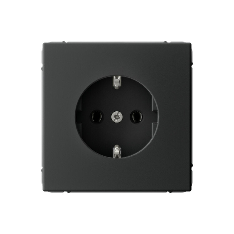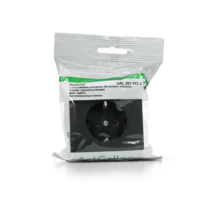 Механизм с быстрозажимными клеммами Systeme Electric серии ArtGallery в цвете карбон розетки одинарной с заземлением и без шторок подходит для сетей 250 В, на ток 16 А.