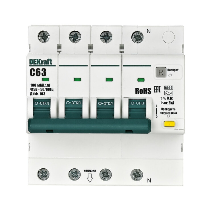 Автоматические выключатели дифференциального тока серии ДИФ-103 6кА NEW Dekraft; 3P+N; номинальный ток 63 А; ном. диф. ток 100 мА; тип диф. расцепителя - A; кривая отключения - С; Icn, Ics = 6 кА; тип устройства - электронный; монтаж – на DIN-рейку. АВДТ обеспечивают три вида защиты - от короткого замыкания, перегрузки и возникновения утечки тока (в частности, вследствие прикосновения человека к токоведущим частям).