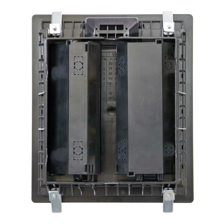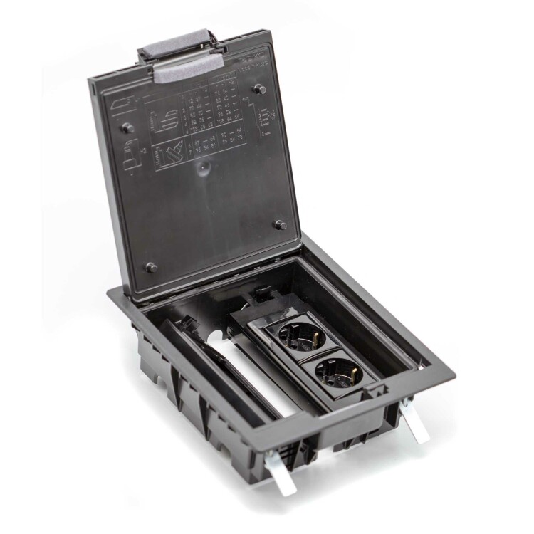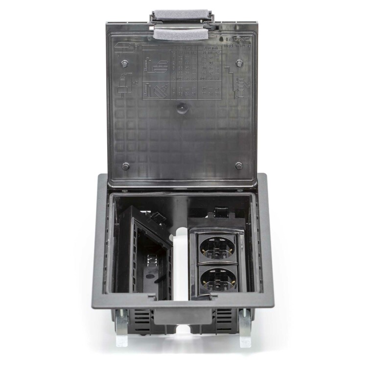 Назначение: организация рабочих мест в помещениях с открытым пространством. Устанавливается в фальшпол (толщина плит 20-45 мм), отверстие для монтажа 218×182 мм. Глубина монтажа от 73 до 108 мм. Крышка открывается под углом 110 градусов, предусмотрен монтаж напольного покрытия толщиной до 8 мм. Крышка усилена стальным листом, нагрузка: на малую площадь − 2000Н, на большую площадь — 5000Н (ГОСТ 61084-2-2-2022), допустимая нагрузка на крышку 450 кг (ГОСТ 61084-2-2-2007). Ручка с запорным механизмом. Возможна установка ЭУИ ЭУИ «Вива» (Viva), «Avanti». Монтаж в 2 подрозеточных блока на 4 модуля каждый. Комплект поставки: лючок 8 модулей, основание и дно подрозеточного блока 4 модуля — 2 компл., винт M4×35 — 4 шт., крепёжный эл. 4 шт. — 1 уп. Каркасы, рамки и ЭУИ заказываются дополнительно. Цвет — чёрный.