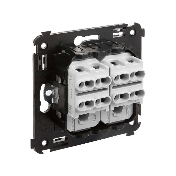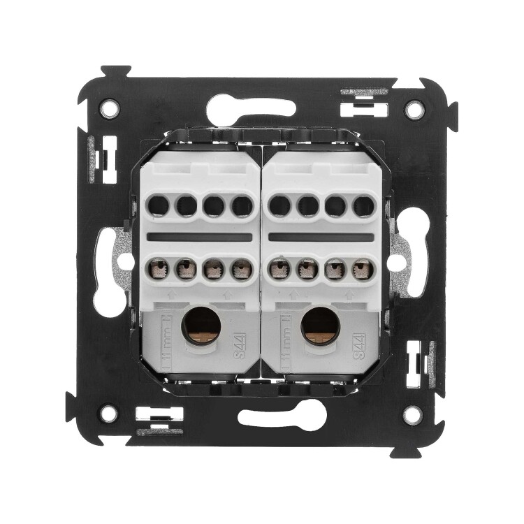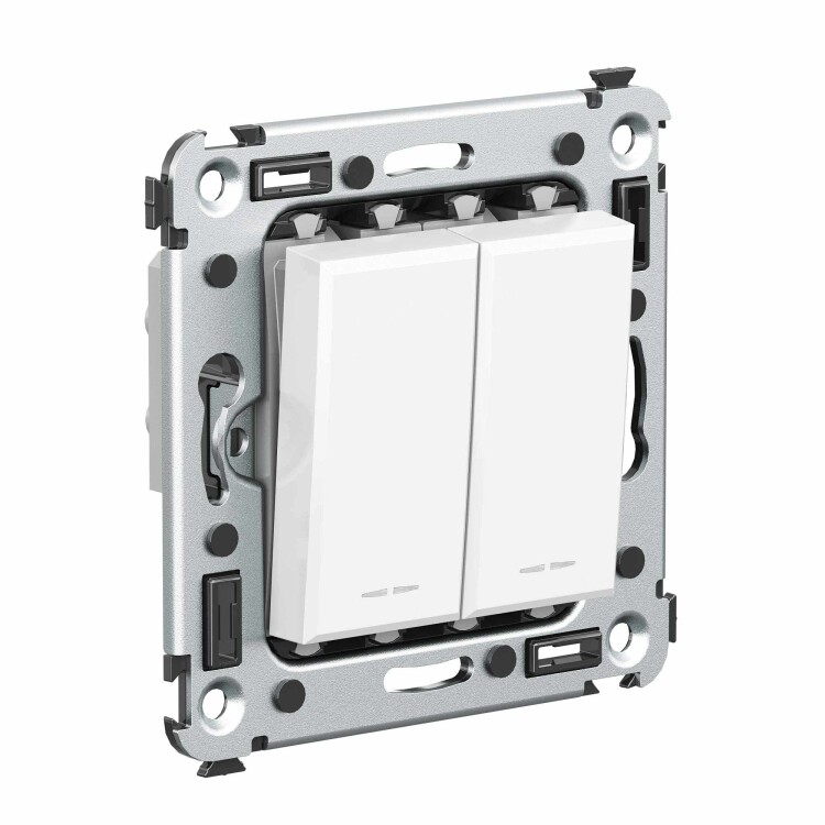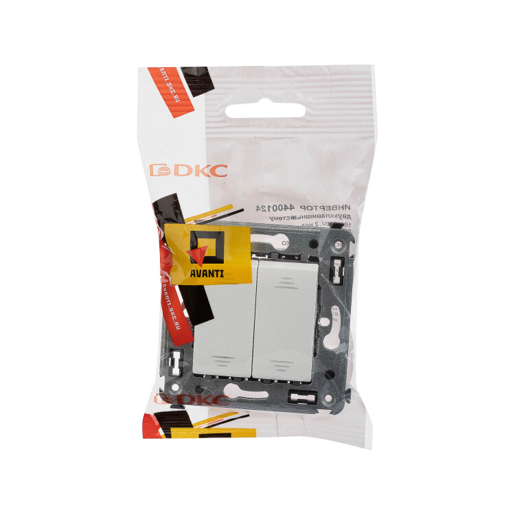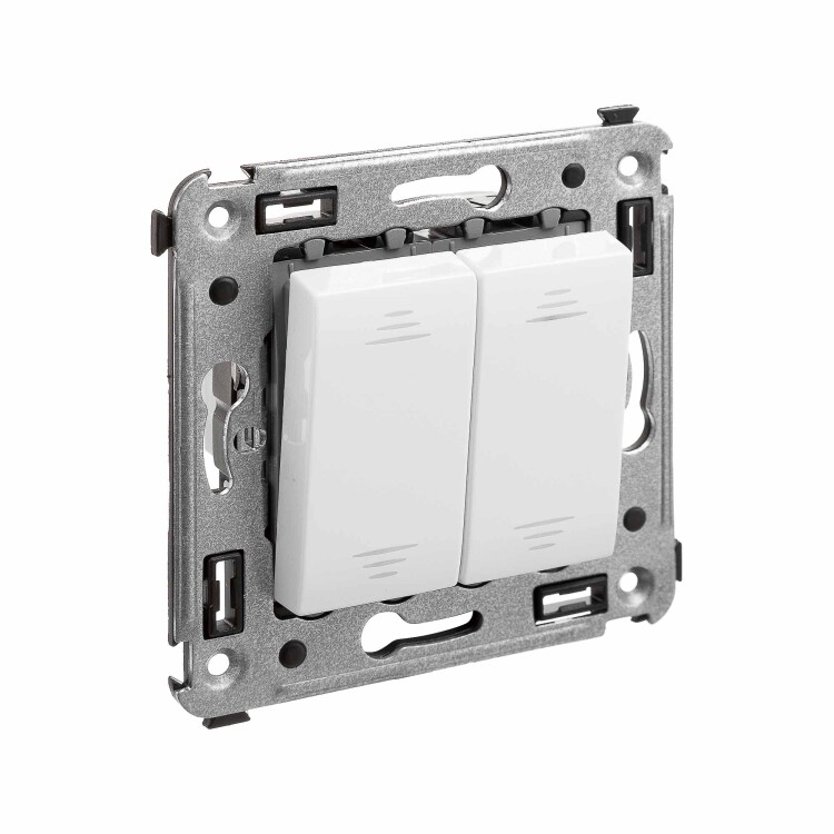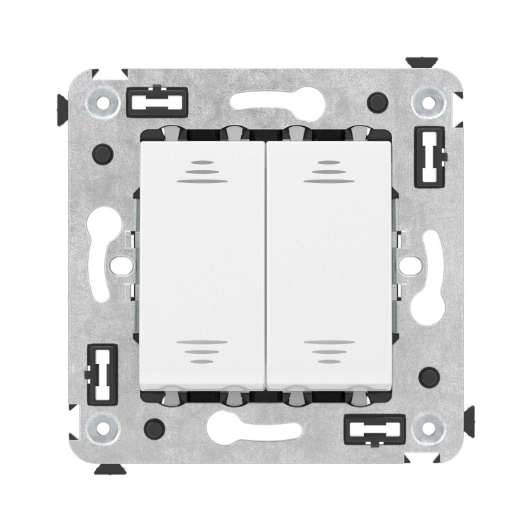 Инвертор двухклавишный. Назначение: для монтажа в подрозеточные коробки глубиной не менее 45 мм (код 59301). Служит для включения/выключения освещения с трех и более мест. Характеристики: 2 модуля, диаметр отверстий для ввода кабелей – 3 мм (по 2 отверстия на одну клемму); винтовые зажимы; фиксация в подрозеточную коробку при помощи саморезов; шаблон для зачистки кабеля – 11 мм; номинальный ток – 16 A; номинальное напряжение – 230 В. Цвет: "Белое облако".