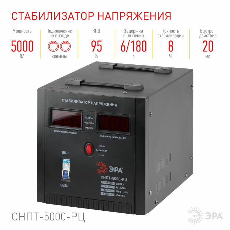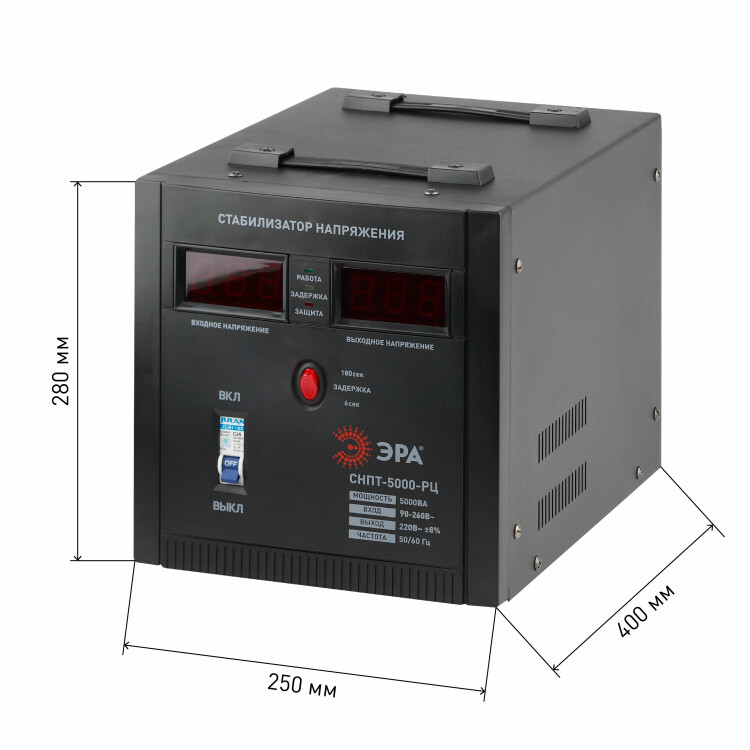 Стабилизатор напряжения переносной /напольный однофазный релейный цвет чёрный модели СНПТ-5000-РЦ. Номинальные характеристики (полная мощность / диапазон входного напряжения): 5000ВА. Предназначен для поддержания стабильного однофазного напряжения питания бытовых приборов при отклонениях значений сетевого напряжения. Выбирая стабилизатор, нужно знать, какое электрооборудование будет к нему подключено: один прибор, группу приборов (наиболее чувствительных к перепадам напряжения в сети) либо вся домашняя (офисная) техника. Затем необходимо рассчитать суммарную мощность защищаемых электропотребителей. Основное условие выбора мощности стабилизатора напряжения - суммарная мощность подключаемой к нему нагрузки не должна превышать полной мощности самого стабилизатора (в противном случае автоматика стабилизатора будет их просто отключать). Точные значения мощности можно узнать из паспортных данных Вашего конкретного потребителя. Стабилизатор подбирается с запасом в 25-30% к его полной мощности.