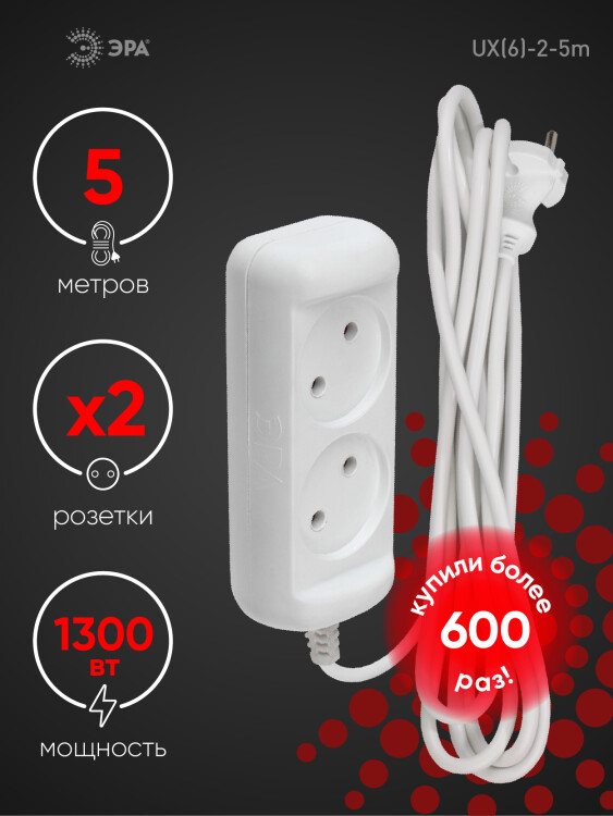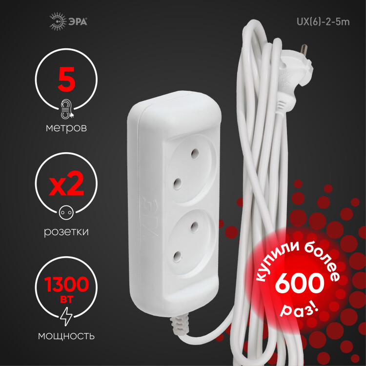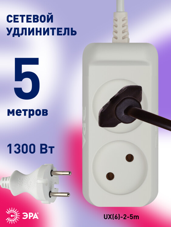 Удлинитель электрический Эра UX(6)-2-5m без зазе мления, ПВС, 2x0,75мм2, 2 розетки, 5 м. Рассчитан на максимальную мощность 6А/1300. Удлинитель Эра станет Вашим надежным помощником, если Ваши любимые электроприборы находятся далеко от розеток. Модель удлинителя на 6А позволяет подключить бытовые приборы общей нагрузкой до 1300Вт. Дизайн удлинителя разработан в России командой Эра Style.