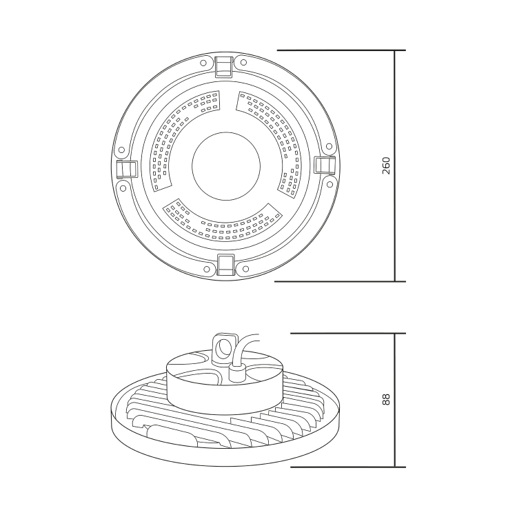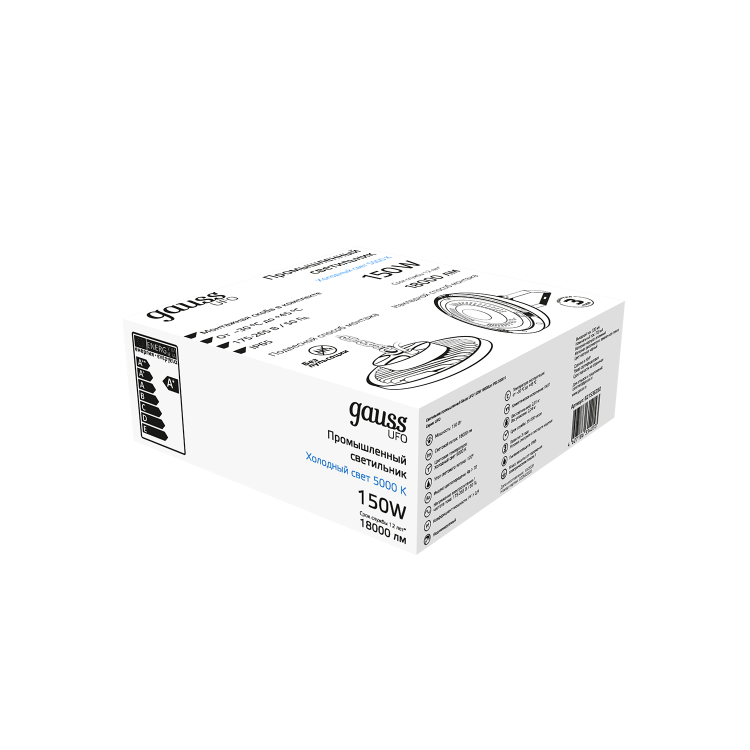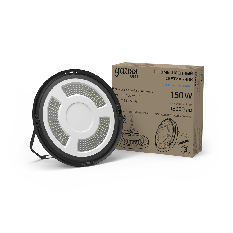 Светильник подвесной промышленный Gauss UFO 150W имеет все характеристики для использования в помещениях с повышенными эксплуатационными требованиями, которым он соответствует: пылевлагозащита IP 65, диапазон рабочих температур от -30 до +45°, яркий световой поток 18000лм, нейтральная световая температура 5000К. Может монтироваться при помощи подвеса за монтажное кольцо или скобы, которая идет в комплекте. Используется для производственных цехов и складов с повышенной влажностью и запыленностью , демонстрационных и выставочных помещений а так же ангаров для сельскохозяйственной и строительной техники.