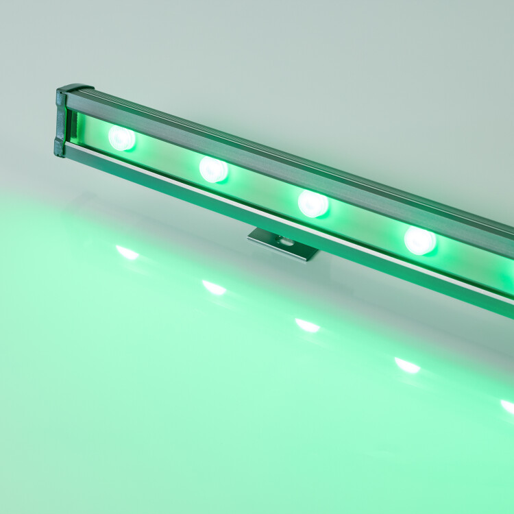 Линейный светодиодный прожектор "WALLWASHER. Мощность 48W, напряжение питания DC 24V. Количество светодиодов 12 штук. Цвет светодиодов RGB-Day(4000K) (4 кристалла в каждом светодиоде), управление по протоколу DMX512, угол рассеивания 15x45°. Корпус: алюминиевый сплав и армированное стекло. Цвет корпуса серый, степень влагозащиты IP65. Габариты 1000x54x35мм.