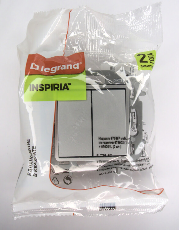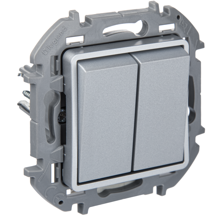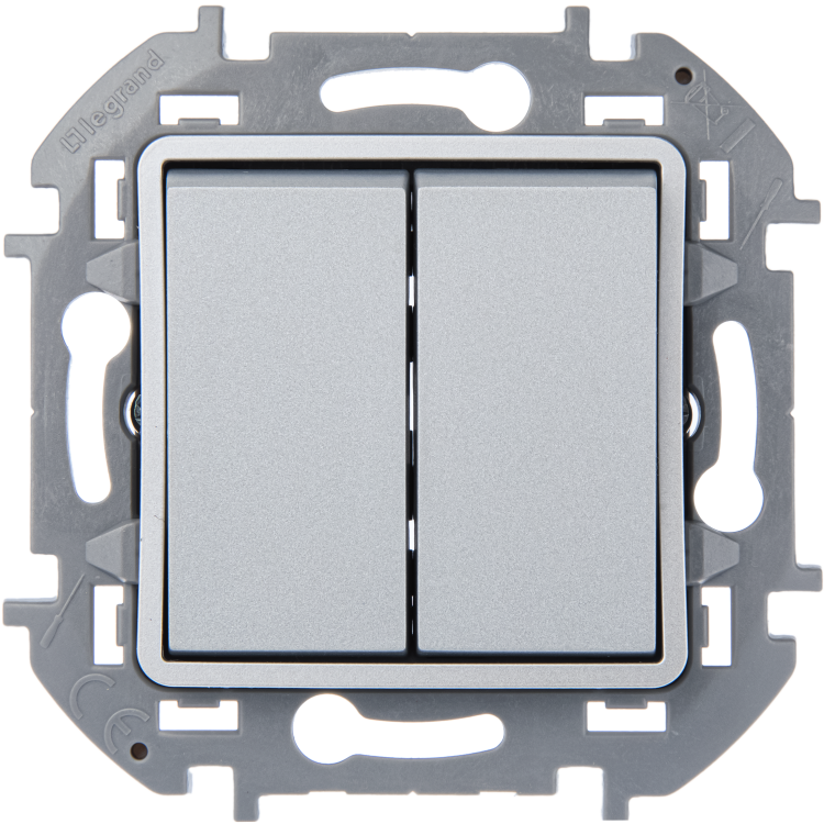 Переключатель модульный двухклавишный Legrand Inspiria для скрытого монтажа, цвет "Алюминий", номинальный ток 10 А, напряжение ~250В.