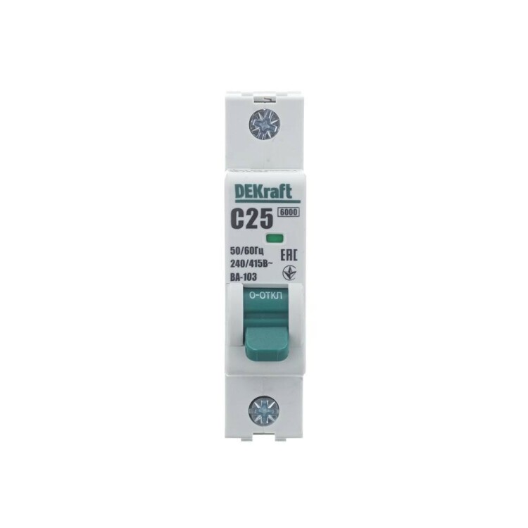 Автоматический выключатель серии ВА-103 NEW DEKraft; 1P; номинальный ток 25 А; характеристика C; отключающая способность 6 кА, что позволяет использовать аппараты в качестве вводных. 5 монолитных заклепок повышают прочность корпуса аппарата. Окошко-индикатор всегда показывает состояние контактов вне зависимости от положения рукоятки управления. Боковые каналы охлаждения повышают стабильность работы при высоких температурах окружающей среды. Есть возможность установки дополнительных аксессуаров с левой стороны устройства. Аппарат на 100% совместим с корпусами и оболочками DEKraft, Systeme Electric.