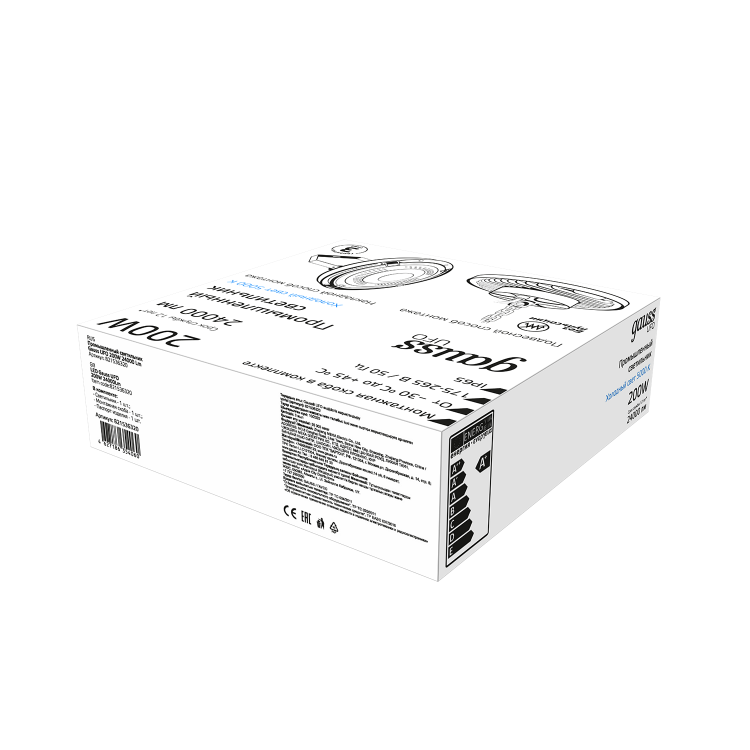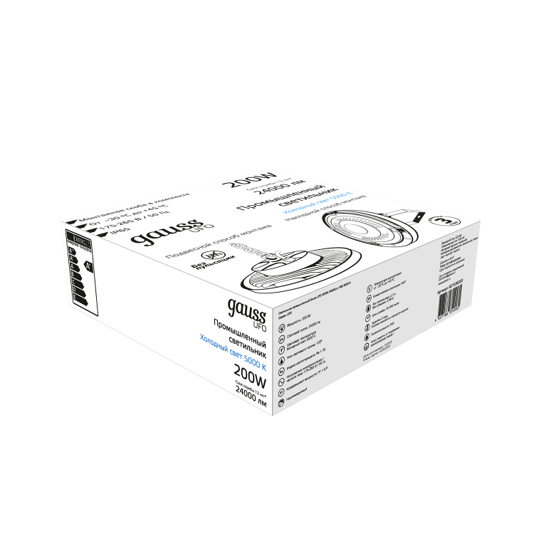 Светильник подвесной промышленный Gauss UFO 200W имеет повышенные характеристики пылевлагозащиты IP 65, большой диапазон температур -30 +45°, яркий световой поток 24000лм с нейтральной цветовой температурой 5000К. Пульсация отсутствует. Светильник предназначен для освещения больших помещений: складов, ангаров, выставочных и демонстрационных залов, цехов, подземных п аркингов. У светильника предусмотрены 2 вида крепления кольцо и скоба идущая в комплекте и соответственно возможно как потолочное так и настенное крепление.