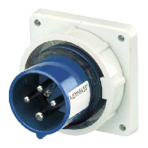 32A, 4п, 9ч, 230B, 50-60Гц. Вилка панельная приборная прямая, на корпусе прибора должен быть выступ для крышки кабельной розетки, фланец 85,7 х 85,7 мм, сечение кабеля 2,5 - 10 кв.мм, винтовые клеммы, никелированные контакты, светло-серая, держатель контактов синий, IP67.