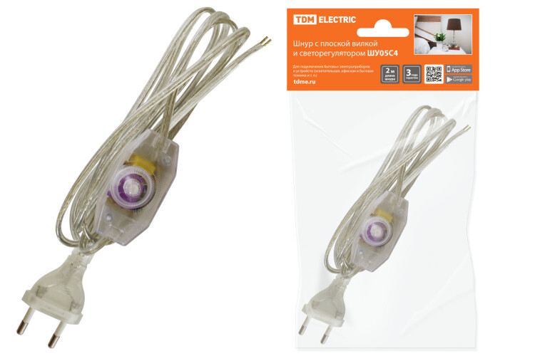 Шнур с плоской вилкой и светорегулятором ШУ05С4 (200Вт, RL) ШВВП 2х0,75мм2 2м. прозрачный TDM (кр.1шт)
