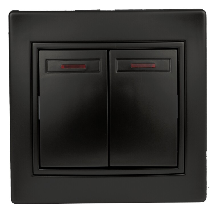 Выключатель 2-клавишный с подсветкой серии Intro Plano скрытой установки цвет антрацит 1-105-05. Номинальные характеристики 10А 250В . Выключатель выполнен из качественного негорючего термопласта, укомплектован одноместной рамкой, оснащён винтовыми клеммами. Вертикальное расположение клемм обеспечивает удобный и надёжный монтаж. Клеммы с двумя отверстиями позволяют соединять соседние выключатели шлейфом. Установка в подрозетник производится как на монтажные лапки, так и на винты. Для установки 2-х и более выключателей в несколько подрозетников в ряд дополнительно используются многоместные рамки: 2-х постовая - 1-502-хх, 3-х постовая 1-503-хх, 4-х постовая - 1-504-хх (где хх - цветовой код: 01 - белый, 02 - слоновая кость, 03 - алюминий, 04 - шампань, 05 - антрацит, 10 - венге, 11 - сосна).