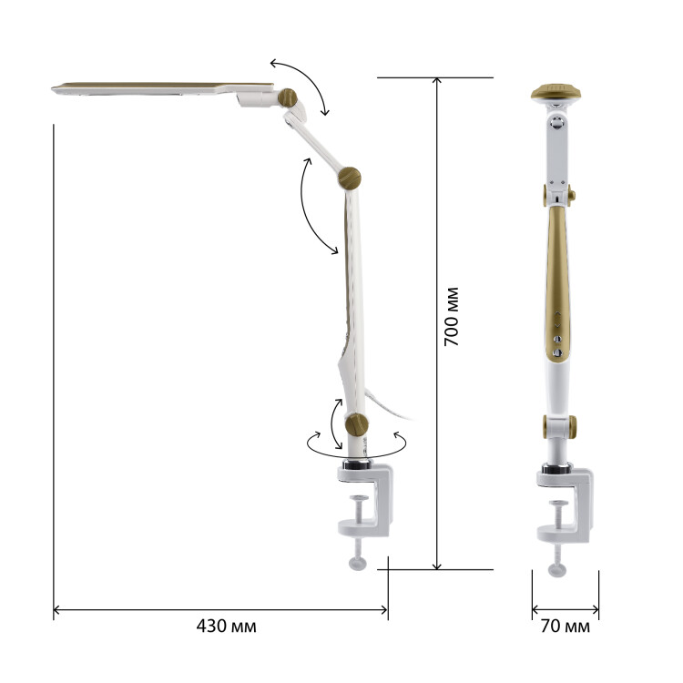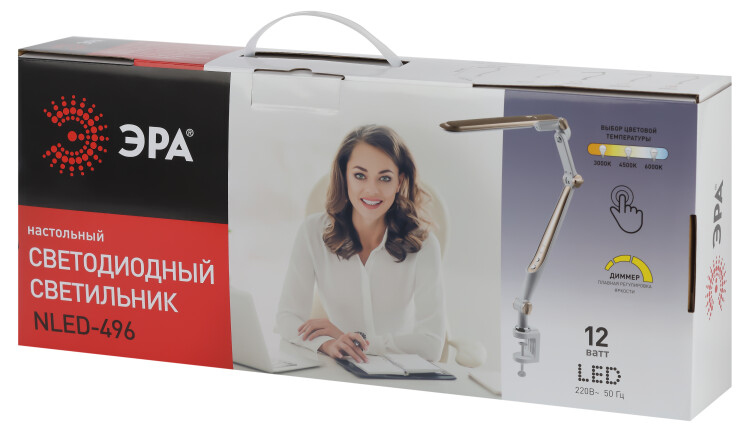 Настольный светильник ЭРА NLED-496-12W-G со светод иодами (LED) в качестве источников света. Оснащен сенсорным управлением с возможностью выбора цветовой температуры (теплый, нейтральный или холодный свет). Плавный диммер для регулировки яркости. Светильник сохраняет выбранные настройки при включении-выключении. Высота плафона регулируется двухсекционной сгибающейся стойкой, направление света регулируется поворотом и наклоном плафона в любую сторону. Удобное крепление на струбцину.
