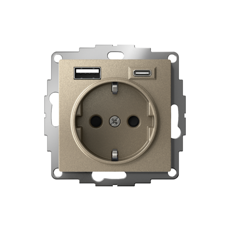 Розетка силовая Systeme Electric (ранее Schneider Electric) серии AtlasDesign 16А в цвете шампань с заземлением и шторками с розеткой USB с двумя разъемами тип А и тип С. Розетка совмещает в себе сразу 3 функции в одном изделии. Удобное и современное решение для дома, офиса и других помещений. Лицевые детали из качественного ABS-пластика, устойчивого к царапинам и УФ-излучению. Заземляющий контакт обеспечивает дополнительную защиту от удара электрическим током. Шторки обеспечивают дополнительную безопасность в доме, где находятся дети. Одно устройство позволяет как подключить бытовые приборы, так и зарядить мобильные устройства.
