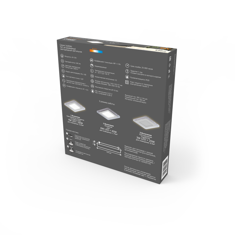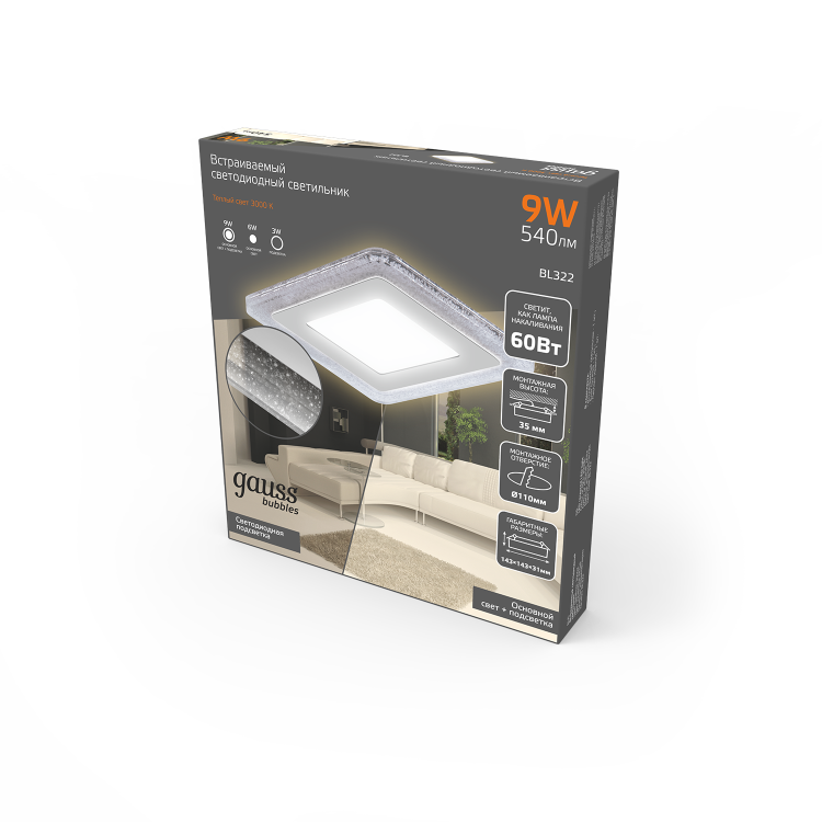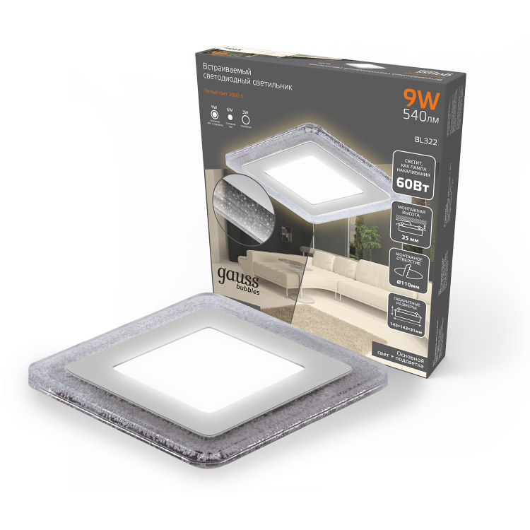 Светильник Gauss Bubbles встраиваемый BL322 форма - квадрат; цвет корпуса - белый с рисунком в виде полупрозрачных пузырьков. Мощность светильника 9w: 6w основной свет и 3w дополнительной светодиодной подсветки. И соответственно 3 режима работы. Корпус светильника изготовлен из прочного алюминия, материал рассеивателя - опаловый пластик. Общая мощность соответствует лампе накаливания 60w. Яркость светового потока 540лм, цветовая температура 3000К - теплый белый свет. Монтажная высота 3.5см позволяет установить светильник даже в самые низкие конструкции потолков.