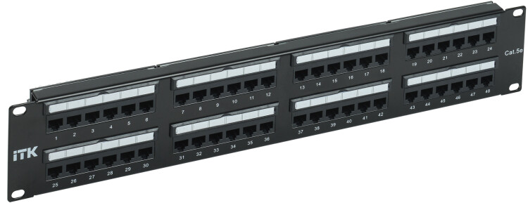 Коммутационные панели или патч-панели являются важнейшей частью любой СКС и IT-инфраструктуры здания и сооружения с большим количеством информационных розеток и терминальных портов конечных пользователей, которые необходимо коммутировать на порты активного сетевого оборудования, размещенного в серверных и распределительных узлах. В зависимости от способа крепления, масштабности кабельной системы, типа сети ITK изготавливает патч-панели для настенного монтажа или монтажа в 19-дюймовый конструктив, по количеству портов: 12-, 24-, 25-, 48-, 50-, категорий: 3 (телефонные), 5E, 6, 6A, в экранированном исполнении и без защитного экрана. Патч-панели для монтажа в 19" шкаф или стойку соответствуют стандарту 19" (482,6 мм), имеют отверстия с левой и правой стороны для крепления на профиль, производятся высотой 0,5, 1 или 2 юнита. На передней стороне все патч-панели ITK имеют специальную площадку для дополнительной маркировки и цифровую нумерацию портов, на обратной стороне модули IDC имеют цветовую и цифровую нумерацию. Также для облегчения монтажа и укладки кабелей имеются изделия с кабельным органайзером спереди или сзади. Патч-панели соответствуют международным стандартам UL 1863, ISO/IEC 11801:2002, TIA/EIA-568-B, кодировка проводников в соответствии с T568B и A. Поставляются в картонной коробке с крепежом.