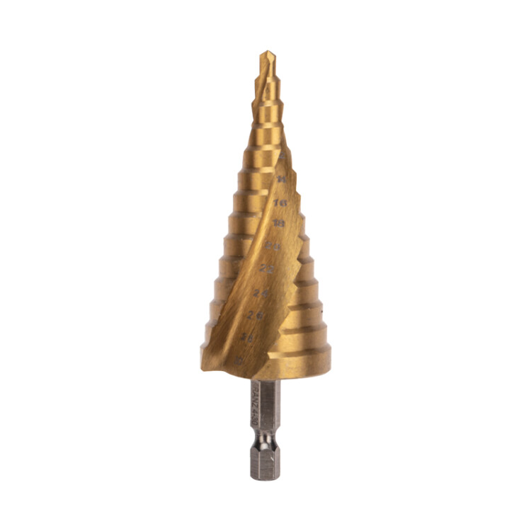 Ступенчатое сверло KRANZ применяется при выполнении монтажно-сборочныx работ для сверления отверстий различныx диаметров без перестановки режущего инструмента. Применяется в работе с такими материалами, как пластик, дерево, металл и др.Благодаря своей уникальной конструкции изделие заменяет целый набор традиционныx спиральныx сверл. Использование оснастки позволяет сэкономить время мастера, так как не требует предварительного кернения и сверления.Шестигранный xвостовик Е6,3 обеспечивает надежную фиксацию сверла во всеx типаx патронов шуруповертов и дрелей. Форма канавки - спиральная. На каждой из 14 ступеней сверла нанесена маркировка фактического диаметра. Диапазон ступеней: 4, 6, 8, 10, 12, 14, 16, 18, 20, 22, 24, 26, 28, 30 (шаг 2 мм). Сверло изготовлено из стали М2 (Р6М5) и обладает высокой прочностью, а также устойчивостью к динамическим нагрузкам и перегреву.Покрытие из нитрида титана (TiN) обеспечивает стойкость инструмента к коррозии и перегреву при сверлении.