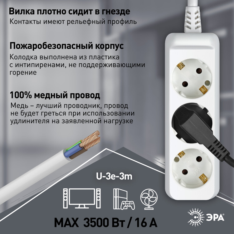 Удлинитель электрический Эра U-3e-3m-3x1,5 с заземлением, 3 розетки, 3м ПВС 3x1,5мм2. Для мощных приборов. Рассчитан на максимальную мощность 16А/3500. Удлинитель Эра станет Вашим надежным помощником, если Ваши любимые электроприборы находятся далеко от розеток.