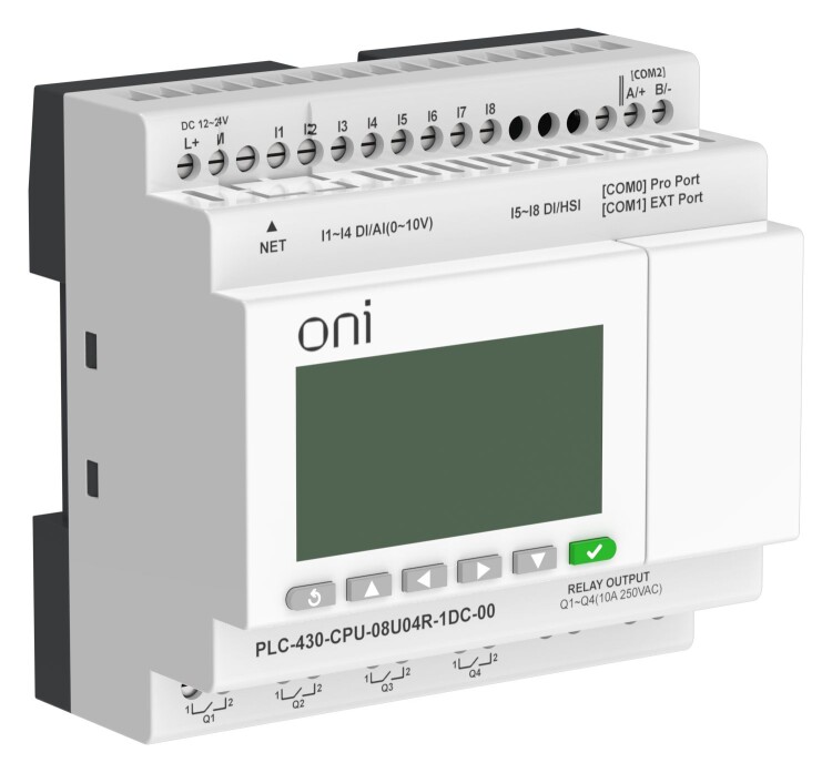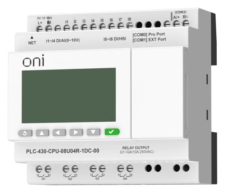 Модуль ЦПУ ПЛК 430 ONI с возможностью расширения количества каналов ввода-вывода и коммуникаций с помощью модулей расширения. С интегрированным полнофункциональным экраном. 8 дискретных входов, 4 из которых можно использовать как аналоговые 0-10В и 4 как высокоскоростные счетчики до 60кГц, и 4 релейных выхода. Архивация данных процесса при использовании стандартной SD карты. Интегрированно 2 интерфейса RS485, 1 интерфейс RS232 и 1 интерфейс Ethernet с поддержкой Modbus TCP/RTU/ASCII и MQTT протоколов. Напряжение питания 24В DC.