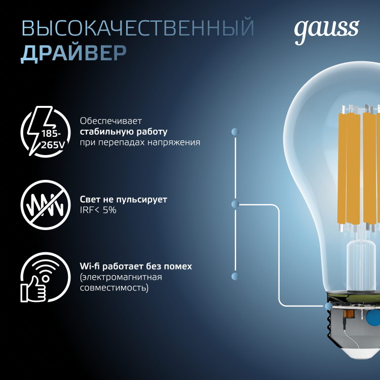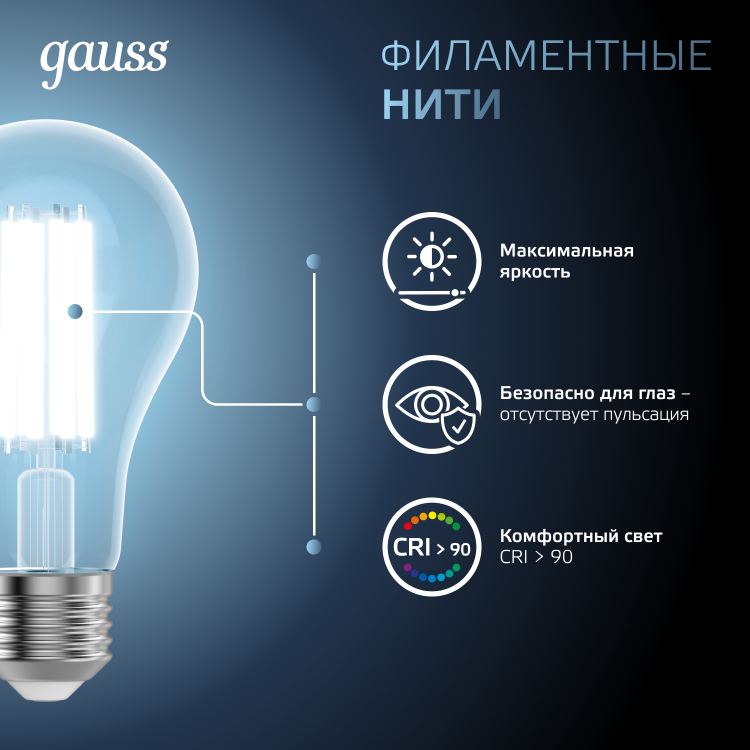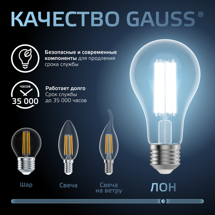 Светодиодные филаментные лампы GAUSS - это новейшие технологии в светотехнике. Лампы имеют привычный вид классических ламп накаливания, освещают пространство на 360о и дают больше света по сравнению с обычными светодиодными лампами за счет прозрачной колбы. Идеально подходят для хрустальных люстр и открытых светильников, а также для реализации дизайнерских решений, где важен вид классических ламп накаливания.