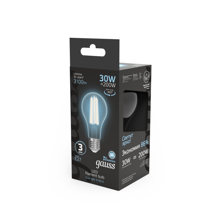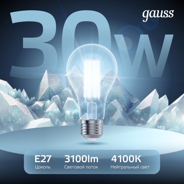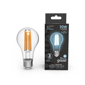 Лампа Gauss Filament А70 30W 3100lm 4100К Е27 LED 1/10/40