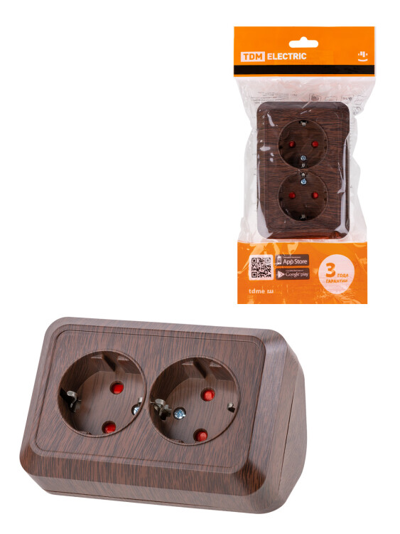 Розетка угловая двойная 2П+3 открытой установки с з/ш IP20 250В 16А бук "Ладога" TDM (кр.6упак)
