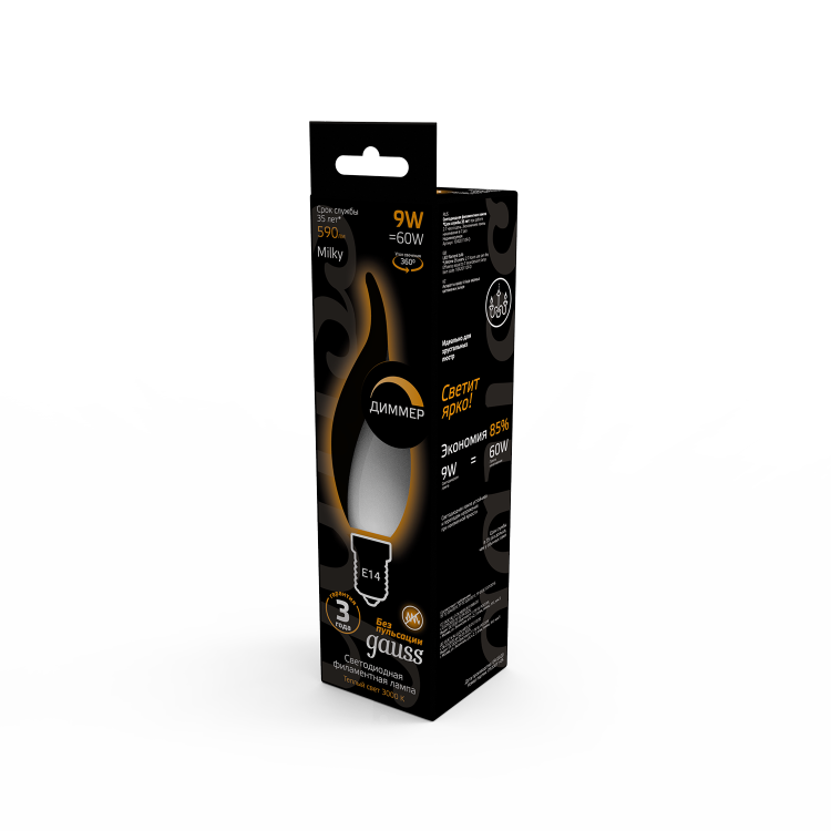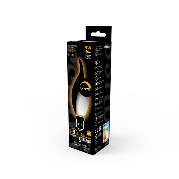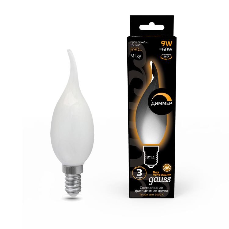 Лампа Gauss Filament Свеча на ветру 9W 590lm 3000К Е14 milky диммируемая LED 1/10/50