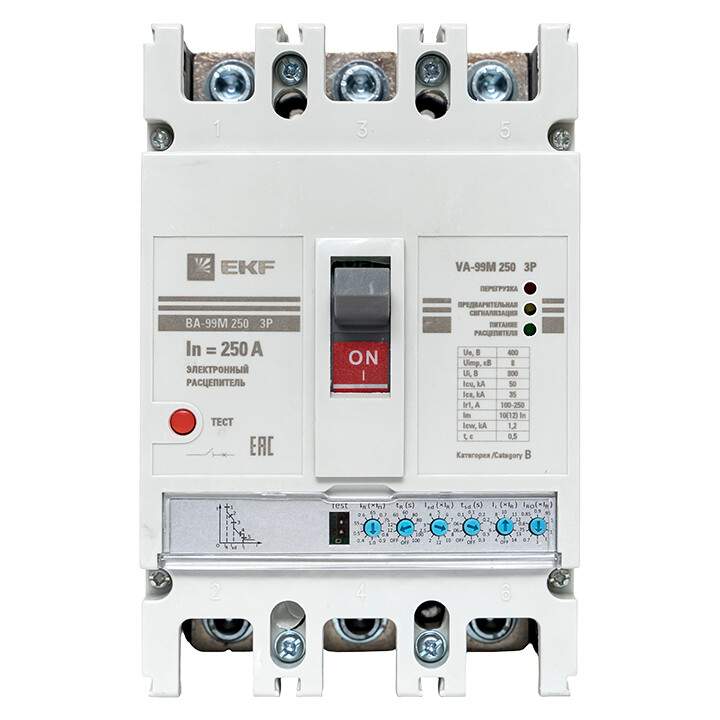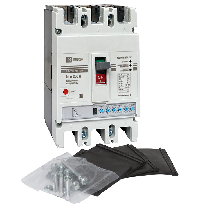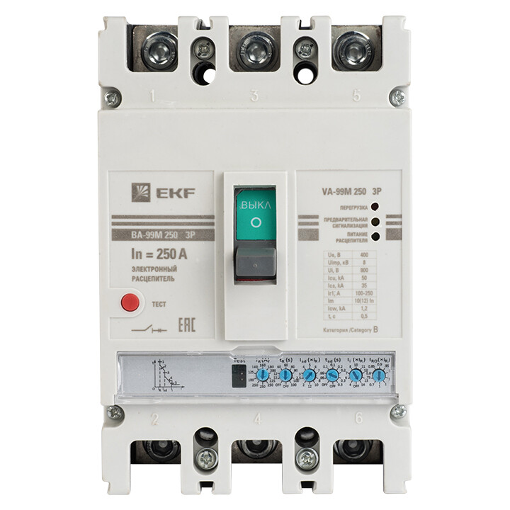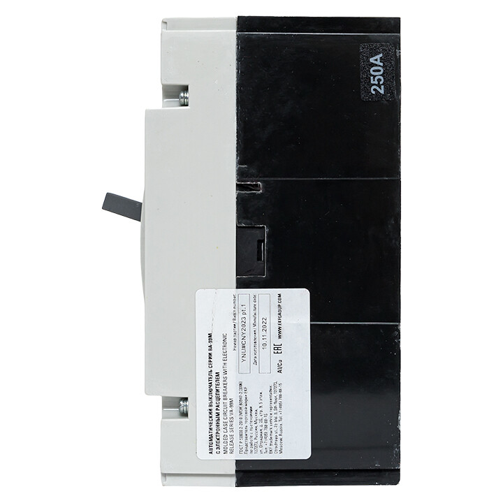 Выключатель ВА-99М выполнен в виде моноблока и состоит из основания и крышки с фальшпанелью, в которой имеется окно для рукоятки управления и толкатель кнопки «Тест» - проверки механизма отключения выключателя. Основание выполнено из термостойкой пластмассы, не поддерживающей горение и являющейся несущей конструкцией для присоединительных зажимов, неподвижных и подвижных контактов с системой дугогашения, механизма управления, блока защиты от сверхтоков. Крышка закрывает все подвижные элементы механизма управления и внутренние токоведущие части.