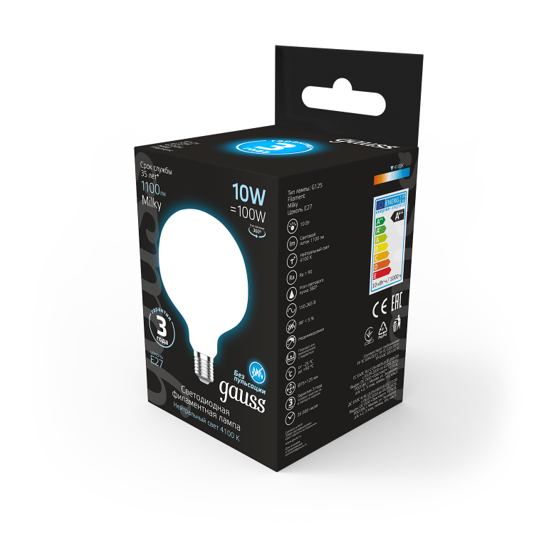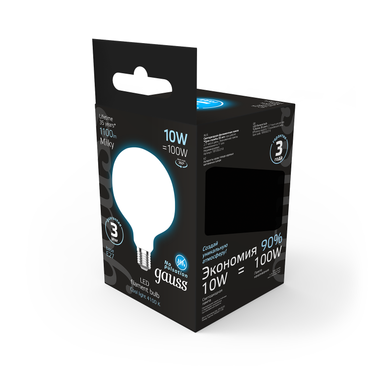 Лампа Gauss Filament G125 10W 1100lm 4100К Е27 milky LED 1/20