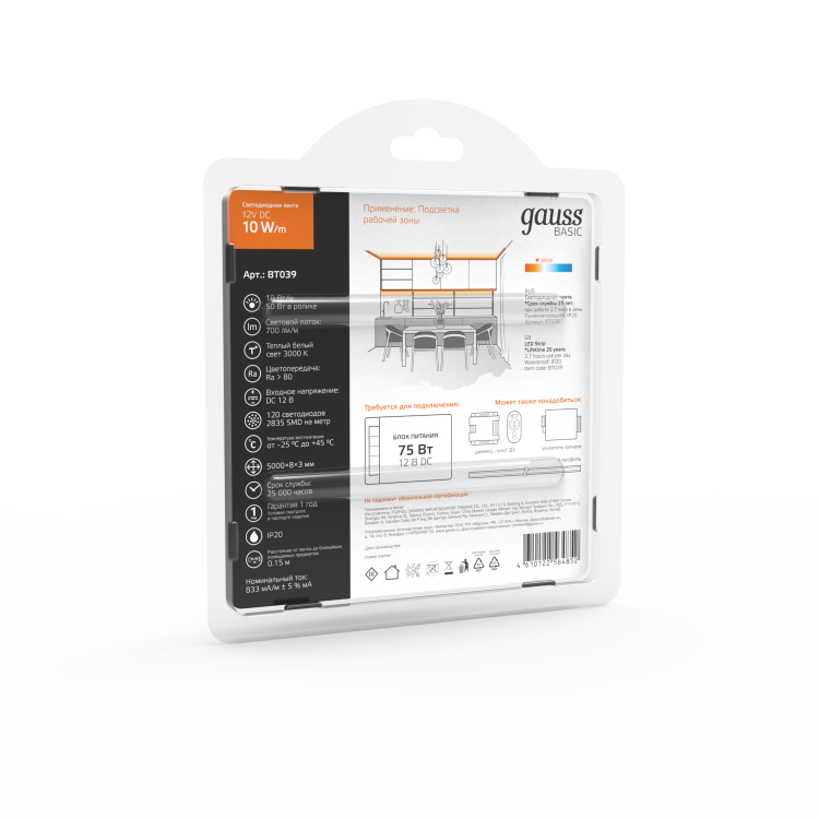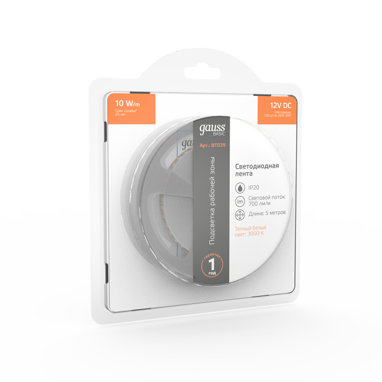 Лента Gauss Basic LED 2835/120 12V 10W/m 700lm/m 3000K 8mm IP20 5m 1/100