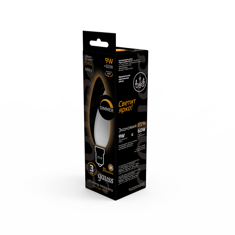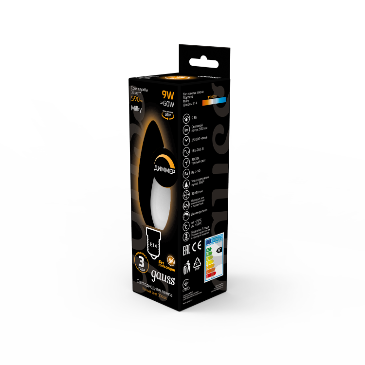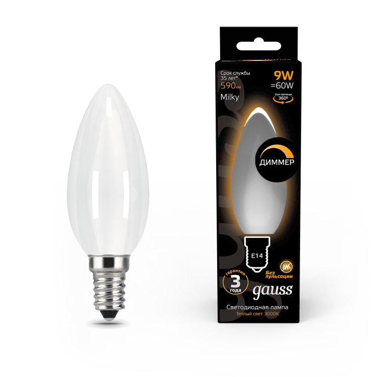 Лампа Gauss Filament Свеча 9W 590lm 3000К Е14 milky диммируемая LED 1/10/50