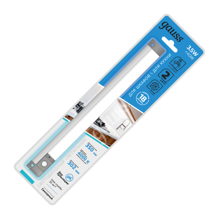 Светильник сенсорный Gauss модульный модель Е 3.5w с двумя режимами работы: 1 автоматический включение датчиком движения с расстояния 3м. Выключается через 2-3 минуты. 2 обычный ручной режим с отключенным датчиком, работает от прикосновения к сенсору. Светильник ультратонкий 1см для кухни - освещение шкафов, рабочей поверхности. У него простой монтаж 2 возможными способами: непосредственно к поверхности двусторонним скотчем или при помощи монтажных металлических скоб. Светильник может быть включен в линию при помощи дополнительных коннекторов.