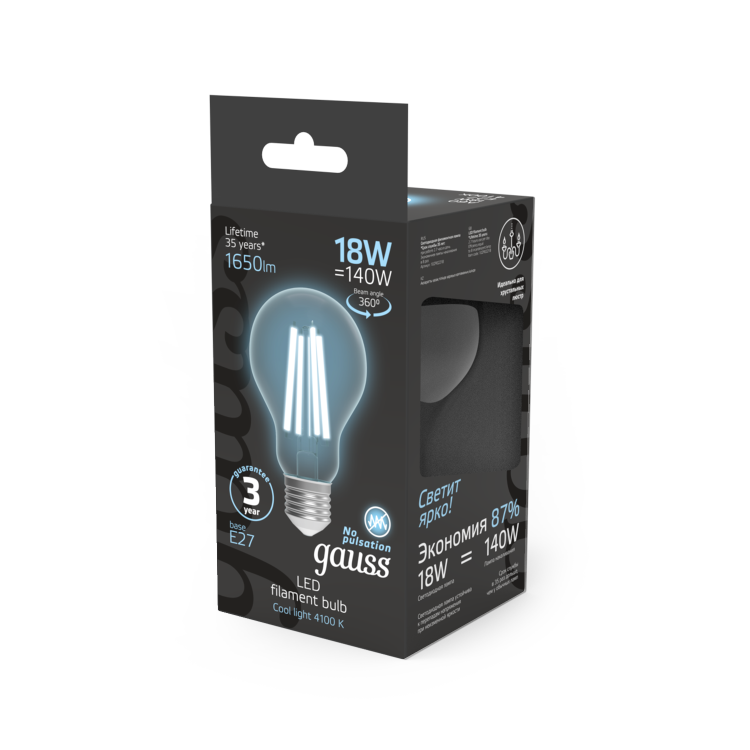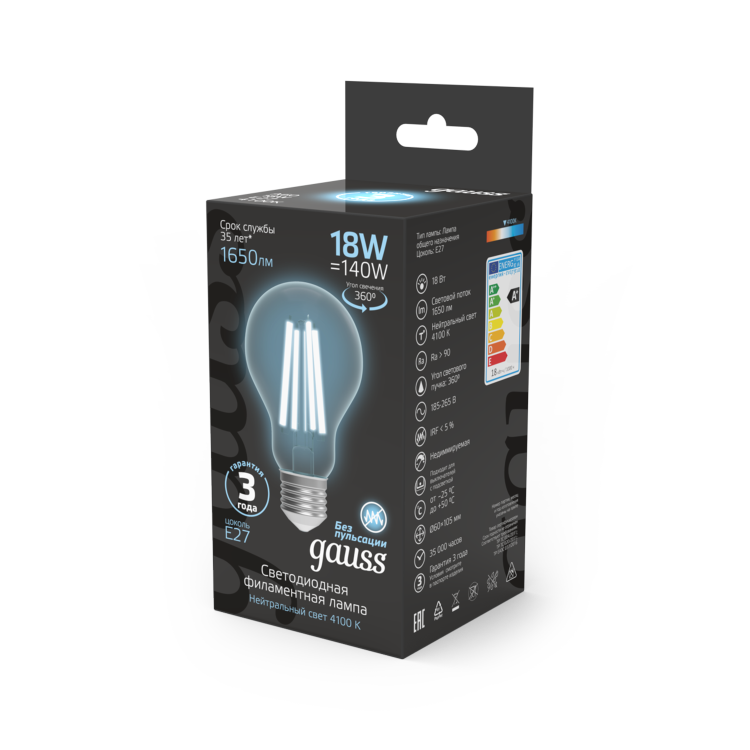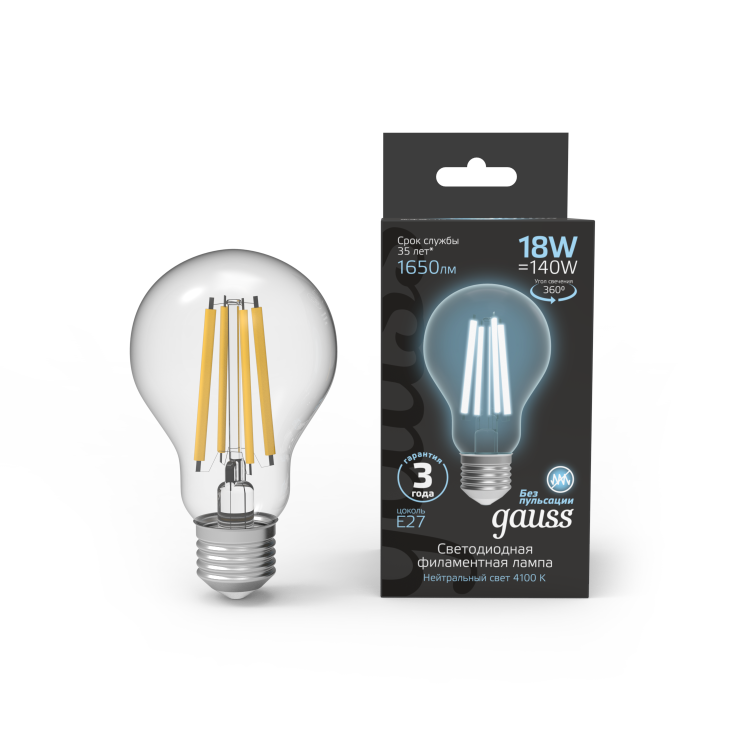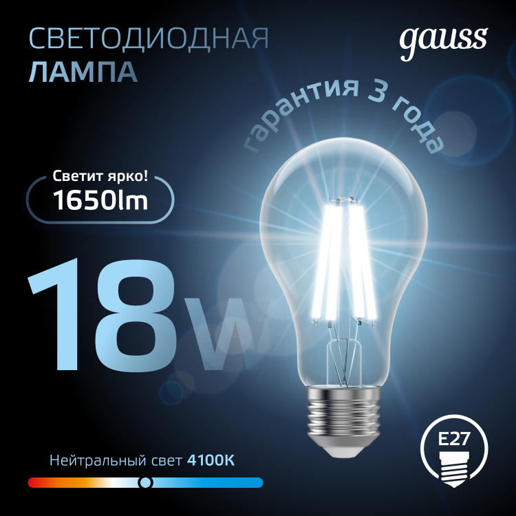 Лампа Gauss Filament А60 18W 1650lm 4100К Е27 LED 1/10/40
