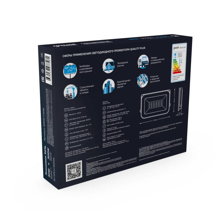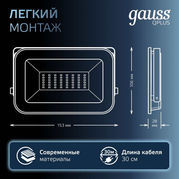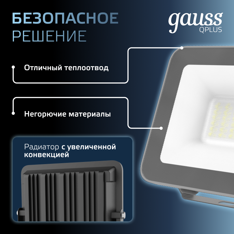 Светодиодные прожекторы Gauss серии Qplus в новом эксклюзивном цвете «графит» предназначены для освещения крупногабаритных помещений и объектов, требующих мощной подсветки. Это могут быть производственные или спортивные площадки, автостоянки, а также фасады зданий. Корпус прожектора Qplus Графит изготовлен из прочного литого алюминия, рассеиватель микропризма выполнен из закаленного стекла. Экономичная LED технология сокращает до 90% затрат на электроэнергию, а технология LCT продлевает жизнь светодиодам за счет пониженной подачи напряжения 60% от номинальной. Использование надежного нелинейного интегрированного драйвера гарантирует работу практически в любых условиях, отсутствие электромагнитных помех и высокий коэффициент мощности более 0,9. Материалы изготовления и конструкция прожекторов Qplus обеспечивают их высокую механическую прочность и полную защиту от пыли и влаги по классу IP65. Для удобства использования и монтажа, светильники оснащены силиконовым кабелем длиной 30 см.