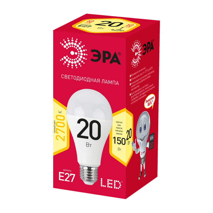 Бытовая светодиодная лампа ЭРА Серии Бюджет, создаёт яркое ровное освещение и экономит до 90% электроэнергии по сравнению с лампой накаливания с аналогичным световым потоком. Светит теплым светом с жёлтым оттенком - такая цветовая температура эффективна для отдыха и уютной атмосферы в доме. Используется в потолочных, настенных, настольных светильниках, в люстрах и бра. Мгновенно в ключается и не нагревается.