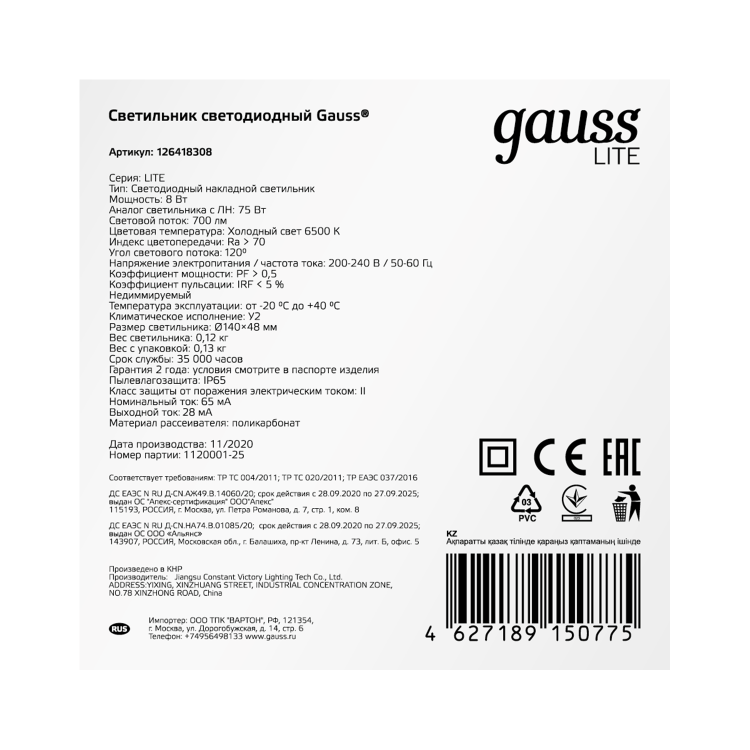 Светильники Gauss Lite предназначены для общего освещения наземных/подземных проходов, проездов, подъездов, лестничных клеток, входных групп, балконов, технических и подсобных помещений, в том числе с повышенными требованиями к пылевлагозащите до IP65.