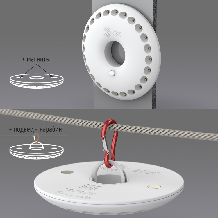 Фонарь собственного дизайна ЭРА, ставший одной из самых популярных туристических моделей. Получил народные названия "НЛО" или "Летающая тарелка" за круглую форму корпуса и футуристический внешний вид. Фонари ЭРА К24 и их блистерная упаковка производятся в России. 24 светодиода эргономично расположены на корпусе в круговом формате. Не перегорают, не требуют замены, разумно расходуют заряд и дают яркое освещение. Особое преимущество и настоящая "фишка" ЭРА К24 - в секретах эксплуатации. Фонарь закрепляется при помощи специального кронштейна (подвес + карабин), превращаясь в яркую походную "люстру". Для металлических поверхностей в тыльную сторону корпуса вмонтированы магниты. Но самый простой способ использования - закрепить на горлышке бутылки. Тогда это уже импровизированный настольный светильник. Надёжный помощник в походе, на охоте, рыбалке, загородном отдыхе. Набирают популярность и нестандартные способы применения ЭРА К24 - его используют как бюджетный вариант кольцевой подсветки при портретных фотосъемках. Сделано в России.