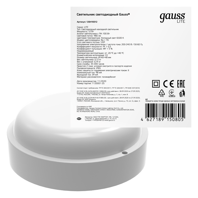 Светильник ЖКХ Gauss LITE круг 12W 980lm 6500K 200-240V IP65 D140*48мм белый LED 1/40