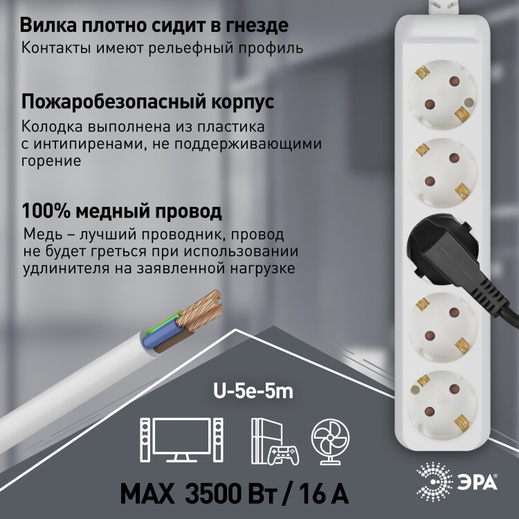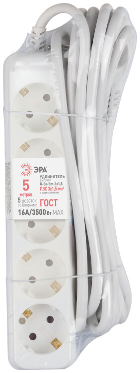Удлинитель электрический Эра U-5e-5m-3x1,5 с заземлением, 5 розеток, 5м ПВС 3x1,5мм2. Для мощных приборов. Рассчитан на максимальную мощность 16А/3500. Удлинитель Эра станет Вашим надежным помощником, если Ваши любимые электроприборы находятся далеко от розеток.
