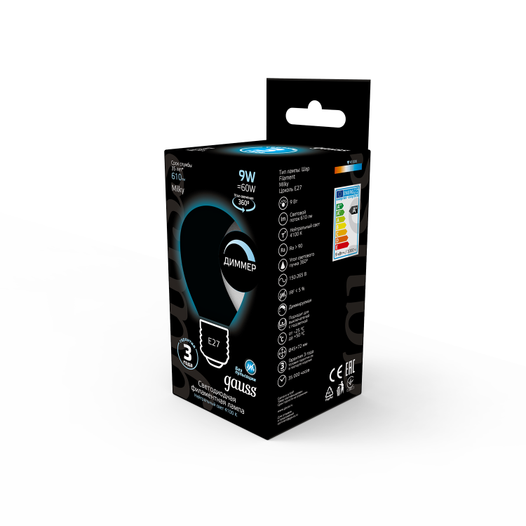 Лампа Gauss Filament Шар 9W 610lm 4100К Е27 milky диммируемая LED 1/10/50