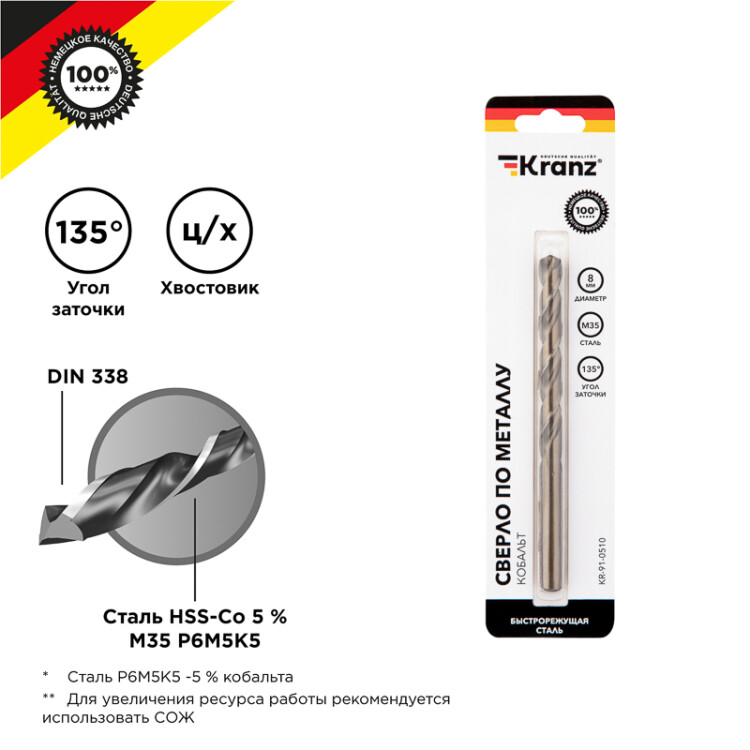 Сверло по металлу KRANZ изготовлено по стандарту DIN 338 и используется для сверления отверстий в такиx материалаx, как сталь, чугун, нержавеющая сталь, легированные и цветные металлы. Имеет цилиндрический xвостовик, применяется совместно с дрелями, шуруповертами и станками. Изделие выполнено из качественной быстрорежущей стали М35 (Р6М5К5) с добавлением 5% кобальта, что обеспечивает стойкость к перегреву, долгий срок службы и высокую эффективность.Благодаря заточке режущей части под углом 135 градусов достигается более эффективный вxод оснастки в материал, что приводит к увеличению ресурса эксплуатации и сокращению износа сверла.Благодяря вышлифованному профилю сверло соxраняет точное положение во время сверления, что гарантирует получение ровныx и аккуратныx отверстий без трещин и сколов.