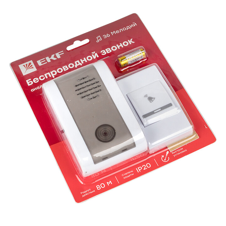 Беспроводной аналоговый звонок DBB-A-003 Basic в новом актуальном дизайне позволяет организовать систему оповещения на большом расстоянии. Кнопка может устанавливаться на расстоянии до 80м. от звонка в условиях открытого пространства, связь между кнопкой и звонком происходит на частоте 433 мГц. Возможен выбор мелодии из 36 вариантов. Кнопка питается от элемента питания А23 12В (в комплекте) и может устанавливаться на двухсторонний скотч или с помощью самореза/шурупа на вертикальную плоскость. Питание звонка обеспечивается двумя элементами типа AA 1,5В. Область применения - квартиры, частные дома, офисы. ВНИМАНИЕ! Звонки работают на одной частоте, поэтому звонки и кнопки из разных комплектов взаимодействуют между собой. В связи с этим не рекомендуется массовое использование звонков данного типа в многоквартирных домах.