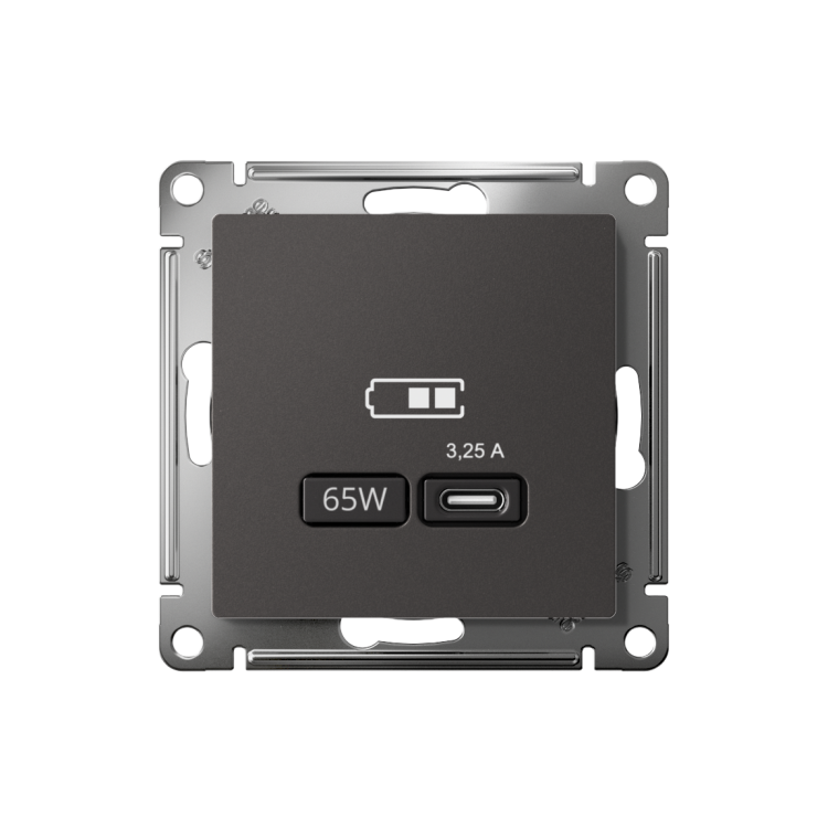 Розетка Systeme Electric (ранее Schneider Electric) серии AtlasDesign в цвете базальт USB с разъемом типа C высокоскоростная. Самая современная USB-зарядка позволяет заряжать ноутбук, а также смартфоны последнего поколения, которые поддерживают функцию быстрой зарядки. Мощность: тип-С - 65Вт. Поддерживает современные протоколы быстрой зарядки QC, PD, последних версий. Лицевые детали из качественного ABS-пластика, устойчивого к царапинам и УФ-излучению.