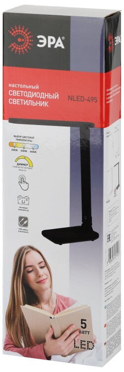 Настольный светильник ЭРА NLED-495-5W-BK со светод иодами (LED) в качестве источников света в дизайне "под кожу". Встроенный литиевый аккумулятор для автономной работы. Подзарядка от USB. USB-кабель в комплекте. Оснащен сенсорным управлением с возможностью выбора цветовой температуры (теплый, нейтральный или холодный свет). Плавный диммер для регулировки яркости. Выключатель для отключения/блокировки сенсора. Направление света регулируется наклоном стойки и поворотом панели со светодиодами относительно стойки для максимального комфорта. Складная конструкция для оптимального хранения.