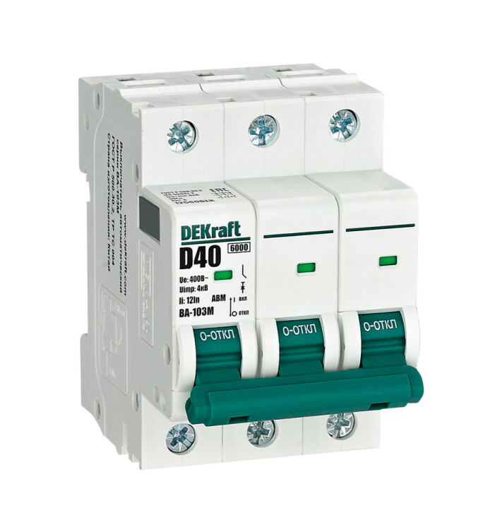 Автоматический выключатель без теплозащиты серии ВА-103M DEKraft; 3P; ном. ток 40 А; ном. раб. напряжение 400 В; кривая отключения D. Автоматические выключатели серии ВА-103М имеют специальное назначение для систем противопожарной защиты и вентиляции и выдерживают ток КЗ до 6000 А. Также они могут использоваться для нечастых оперативных включений и отключений указанных цепей. Автоматические в ыключатели соответствуют директиве RoHS, имеют расширенный диапазон рабочих температур от -25 до +60 °C, удобны и безопасны в эксплуатации.